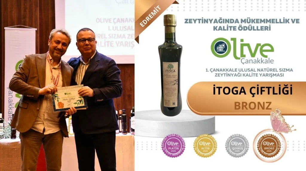 İTOGA Çiftliği, Zeytinyağı Akademisi’nin; Çanakkale Sanayi ve İş İnsanları Derneği, SS Geyikli Beldesi Tarımsal Kalkınma Kooperatifi ve Çanakkale Zeytinyağı ve Zeytin Üreticileri Derneği ile ortaklaşa düzenlediği I. Ulusal Çanakkale Natürel Sızma Zeytinyağı Kalite YarışmasıOLIVE ÇANAKKALE 2025 – Zeytinyağında Mükemmellik ve Kalite Yarışması”nda ödüle layık görüldü.